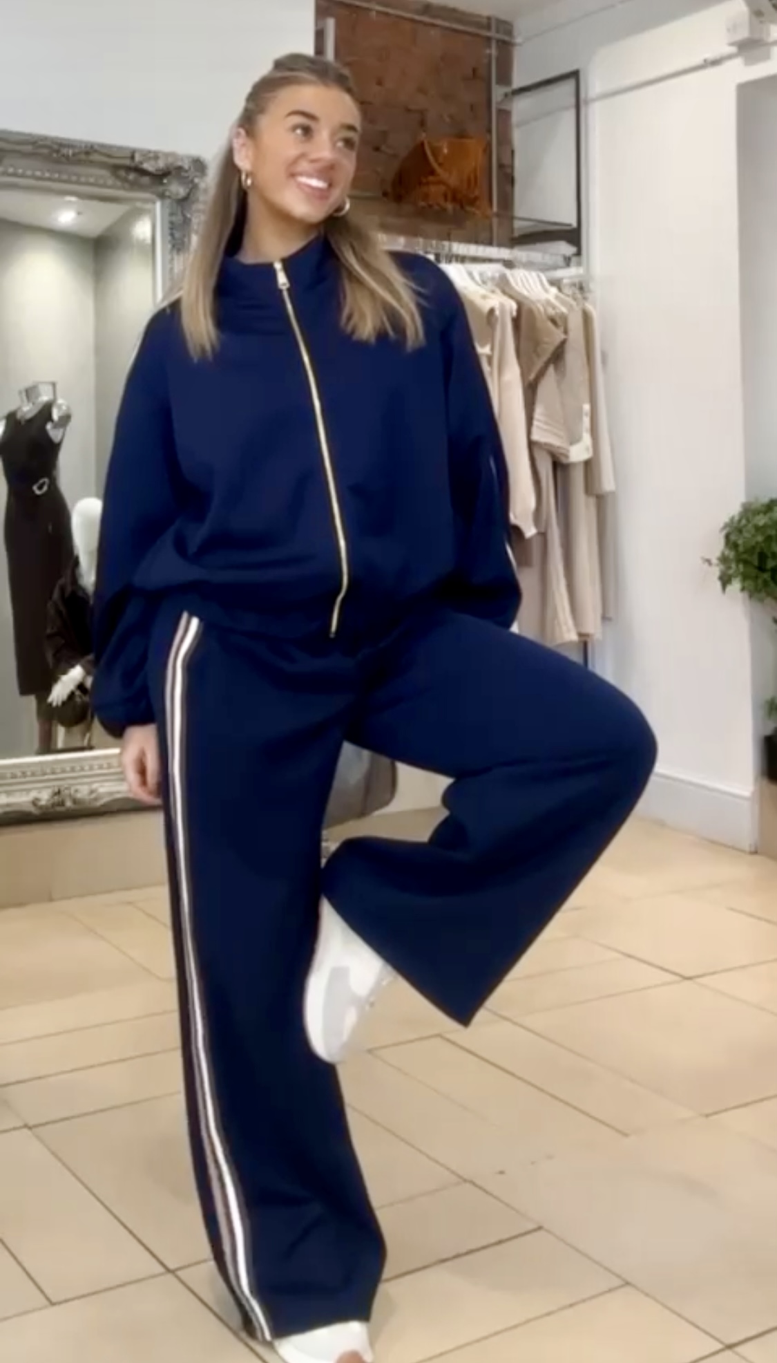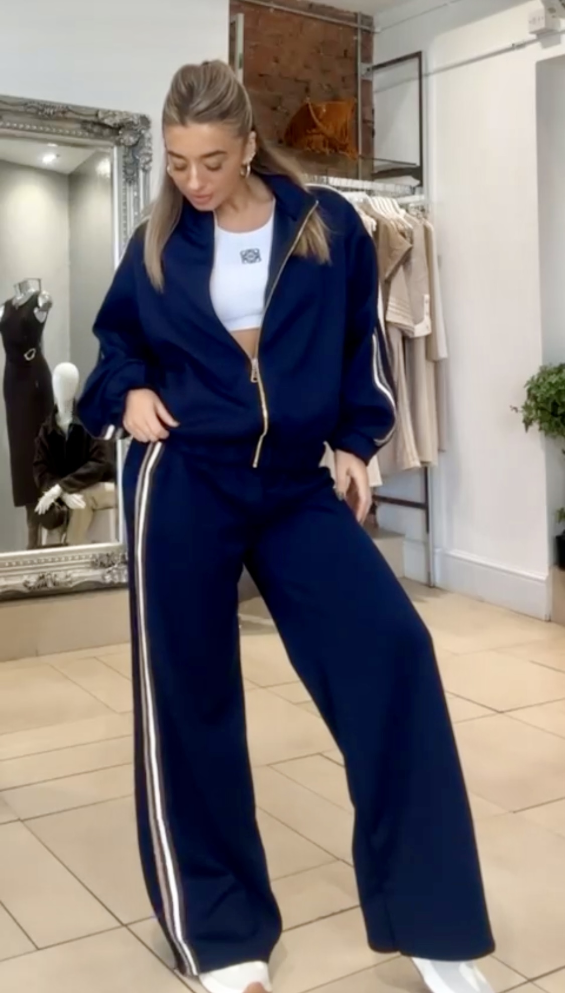 Elevate your off-duty style with this luxe matching tracksuit set, featuring a zip-up jacket and coordinating bottoms. The jacket is designed with a high funnel neck and an exaggerated waistband for that bubble-style silhouette when zipped — flattering, comfortable, and effortlessly cool. Full-length sleeves and contrast stripes down the arms and legs give it a bold, sporty edge.