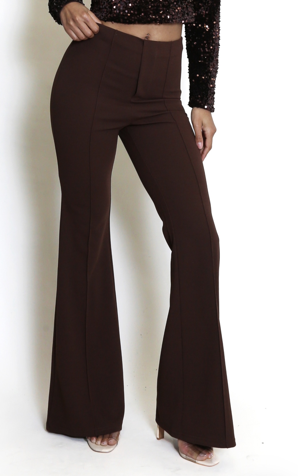 These smart stretch-fabric trousers feature a front seam, a subtle flare kick, and a smooth concealed fastening that lies neatly against the waist. They are available in black brown and burgundy in sizes. XS- L- perfect for dressing up or for every day office where