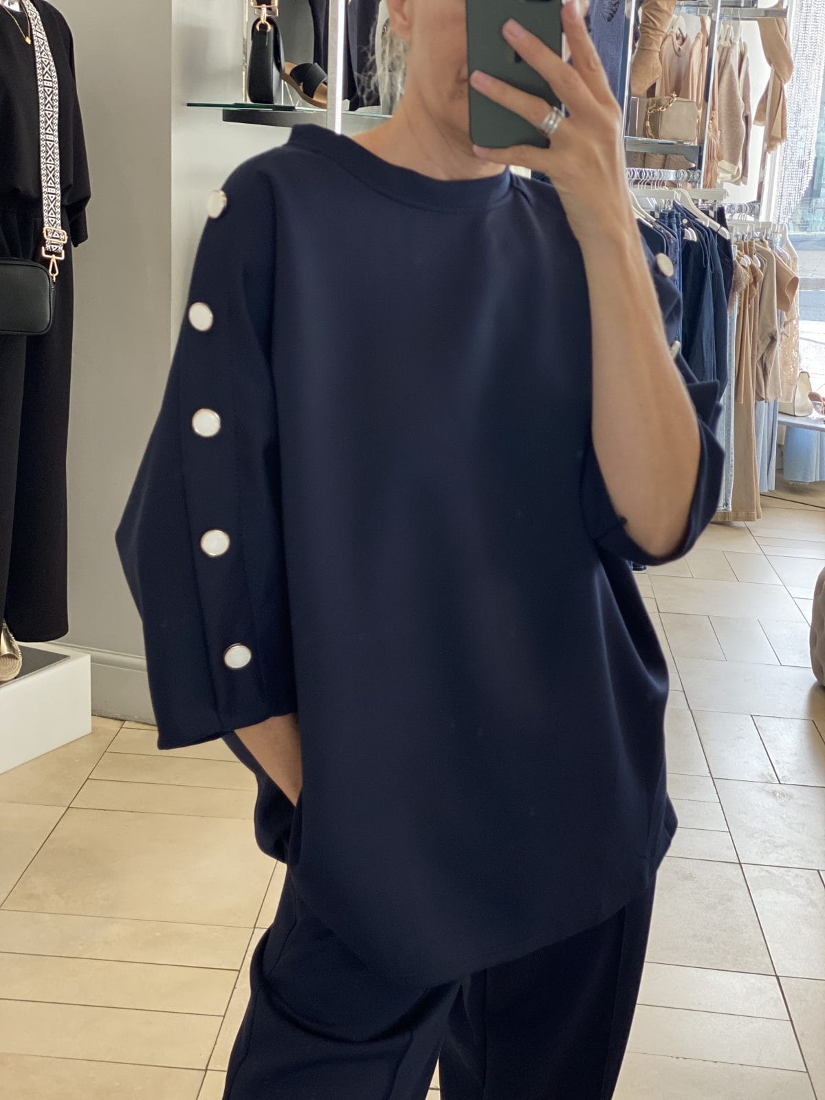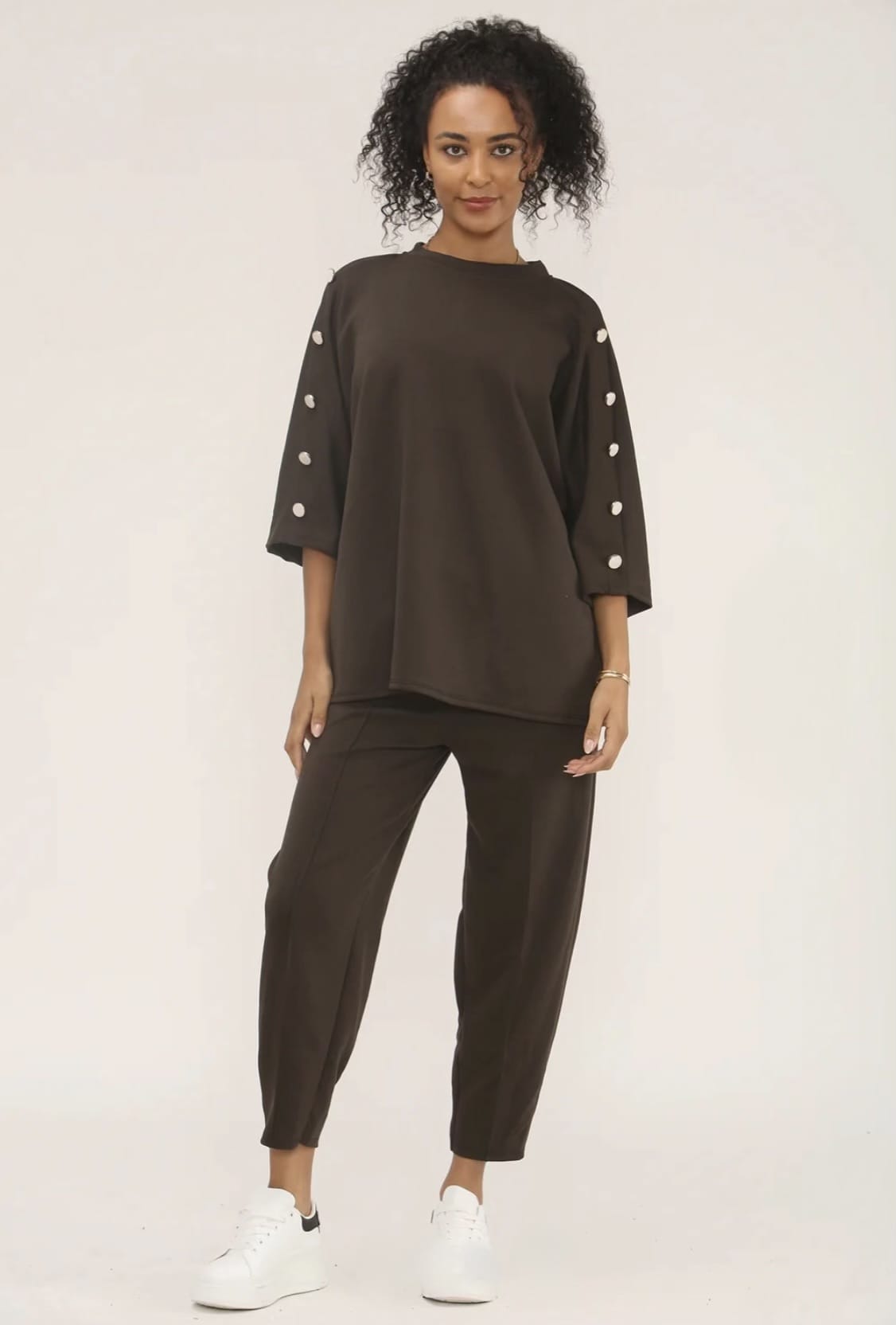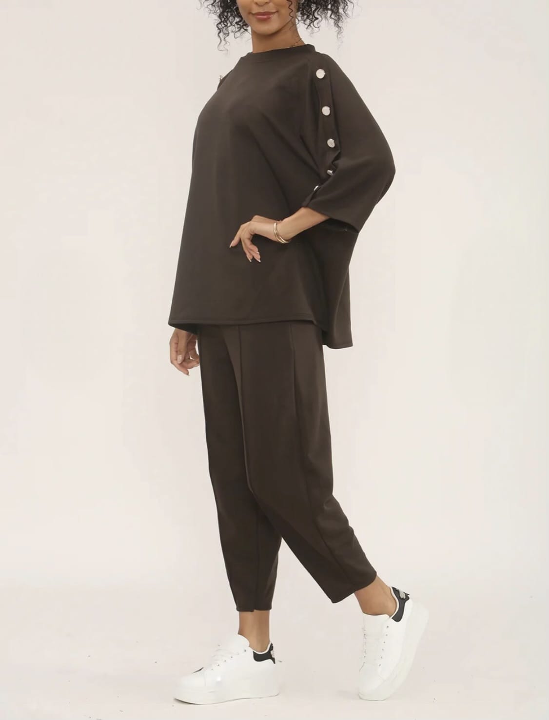 This beautifully soft oversized lounge set features statement button detailing from shoulder to sleeve. Paired with tapered ankle-length trousers with front seam detailing and adjustable waistband and side pockets for a comfortable flattering fit.
