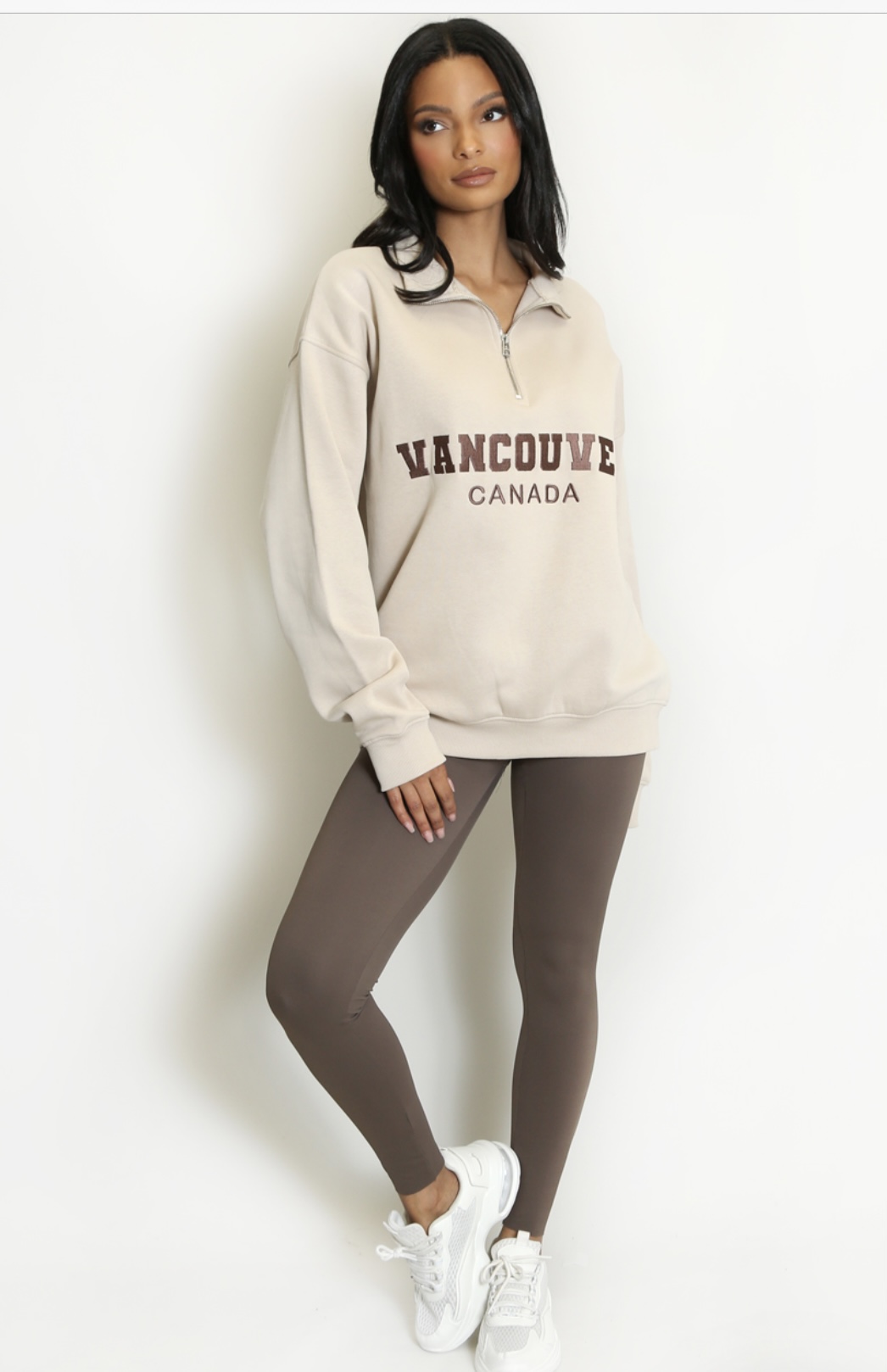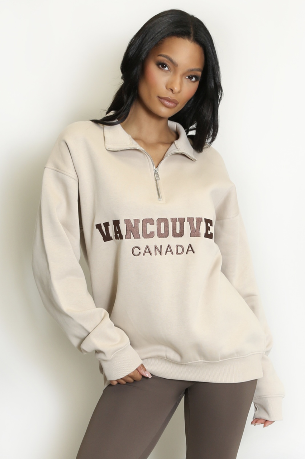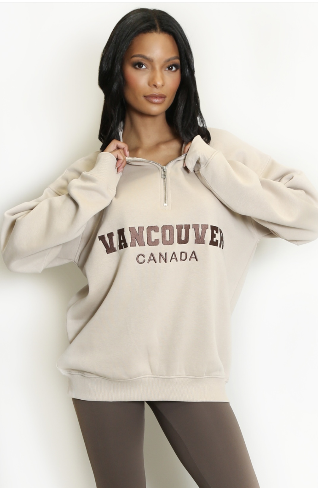 Our oversized half-zip sweatshirt features a cozy fleece lining and embroidered” Vancouver “ logomaking it the perfect throw-on for school runs, gym sessions, or casual days out—style it effortlessly with jeans or leggings; available in sizes XS to XL.”