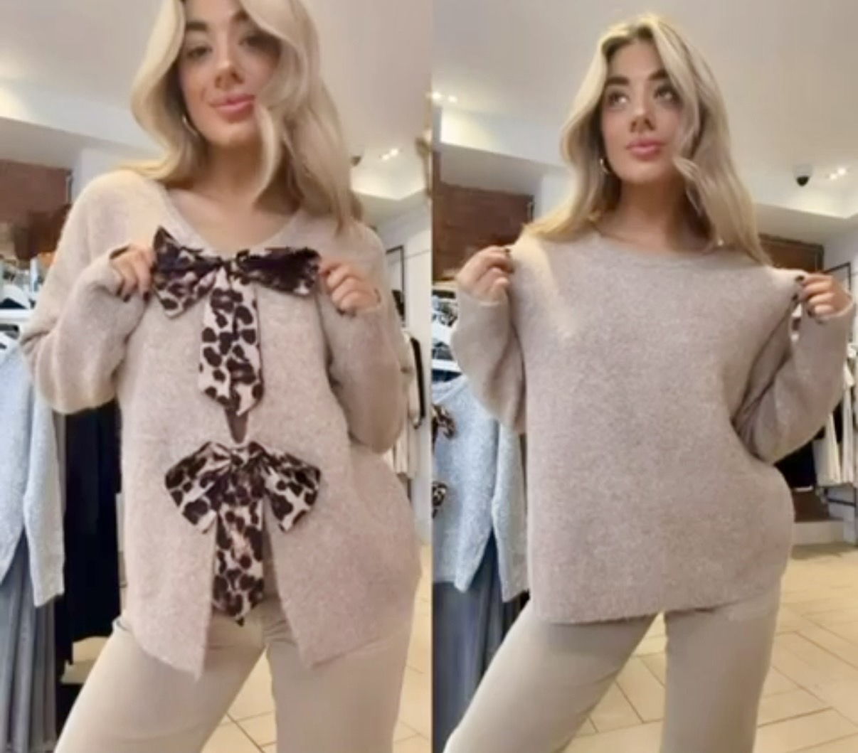 This lightweight, cozy jumper is designed to keep you warm without feeling heavy. It features two leopard print bows on the reverse, but the versatile design means it can be worn either way — the bow detail looks just as beautiful worn at the front.