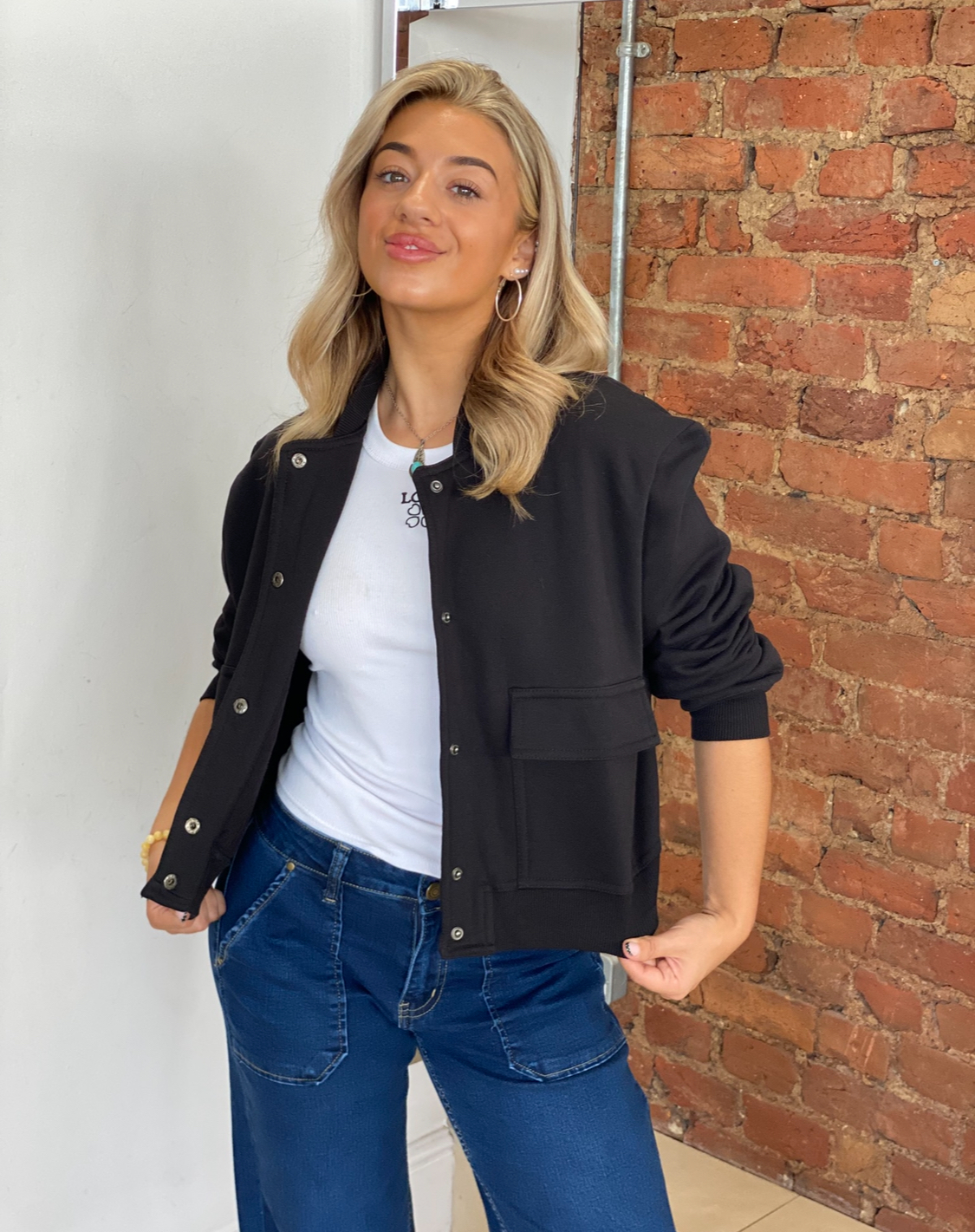 “Stay warm & in style with our fleeced cropped bomber jacket, featuring popper button fastening for a snug, street-ready look.”