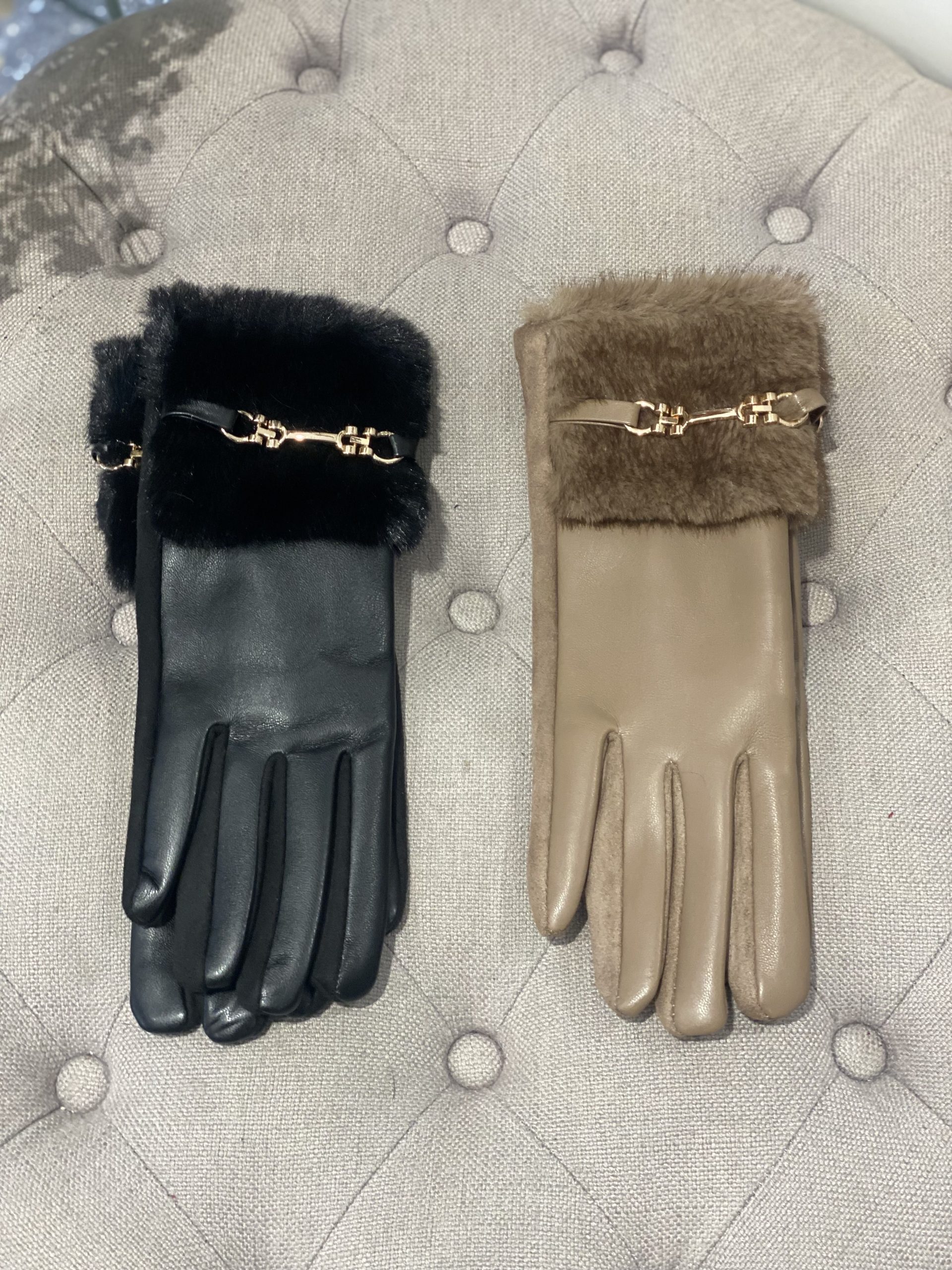 Stylish and cosy gloves available in various colours, featuring a chic gold-tone chain detail and a soft suede-feel underside. An embroidered fingertip allows you to use your iPhone or any touchscreen without removing your gloves. One size fits most ladies’ hands. These elegant, leather-look gloves make an ideal Christmas gift.