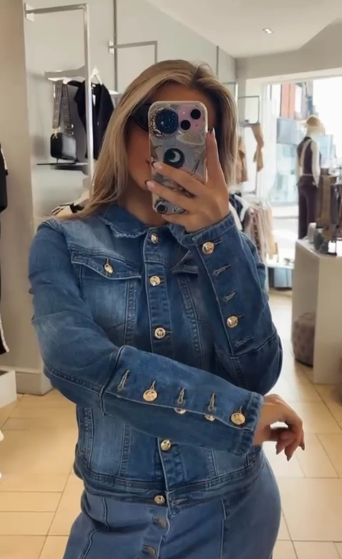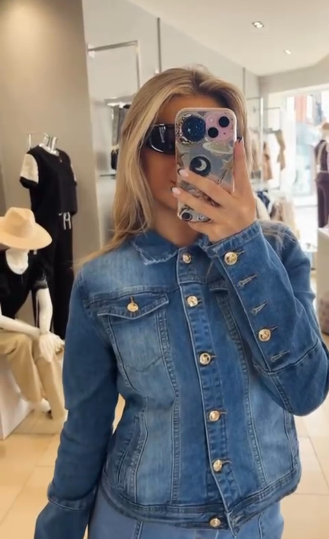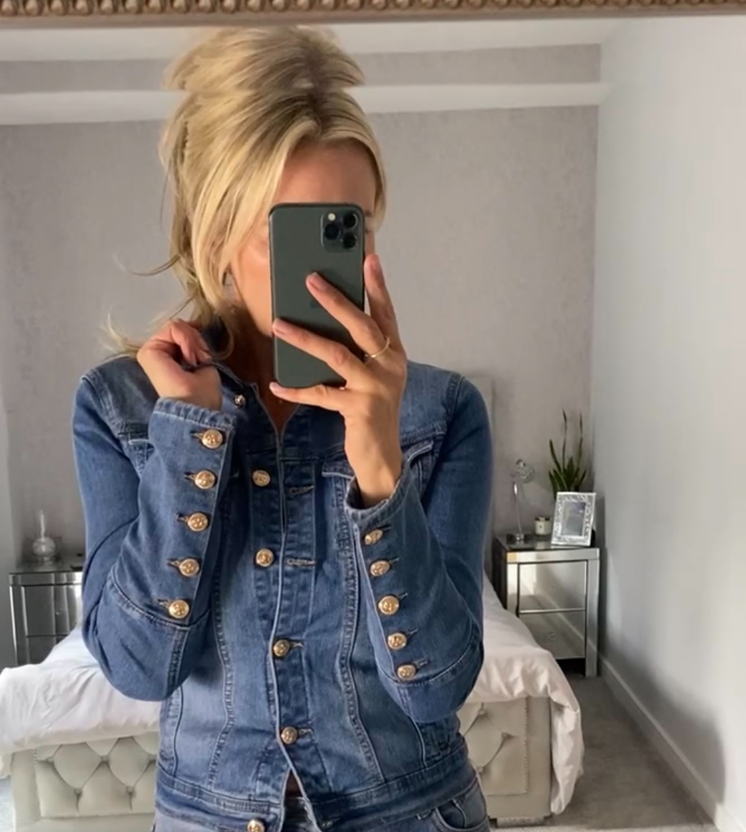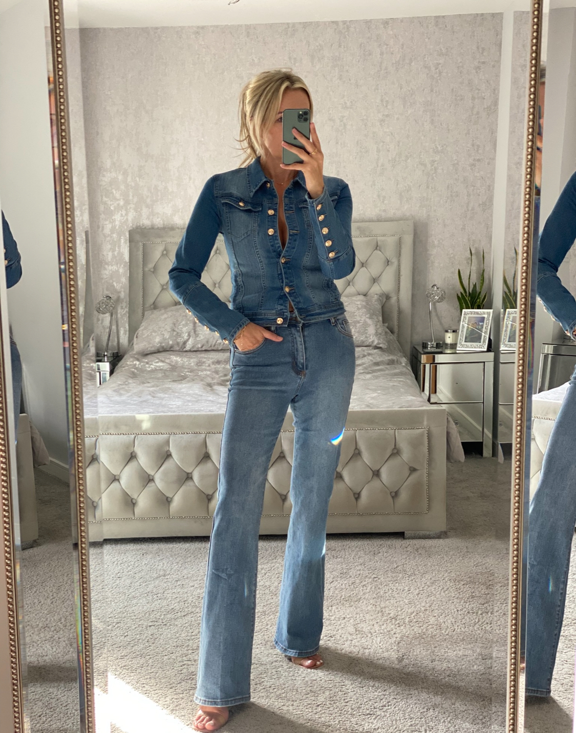 Introducing our stylish denim jacket with a slight military twist, crafted from a lovely mid-blue wash fabric with a comfortable stretch. Featuring gold button details on the sleeves, front pockets, and button fastening, this jacket pairs perfectly with double denim or trousers. Available in five sizes, it’s true to size for a perfect fit.”