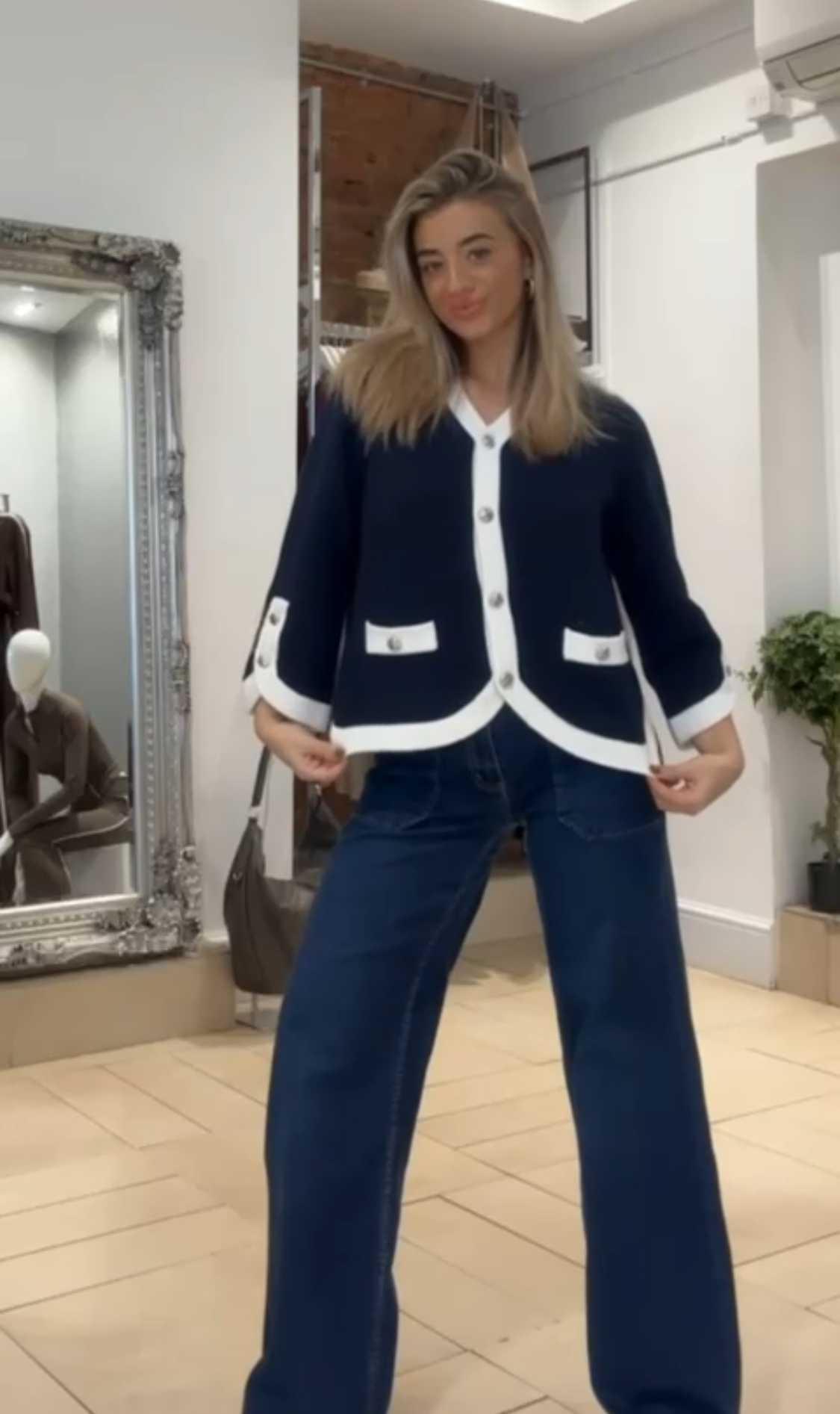 A chic two-tone cropped cardigan with three-quarter sleeves, elegant silver buttons and the perfect fit for high waisted jeans or trousers.