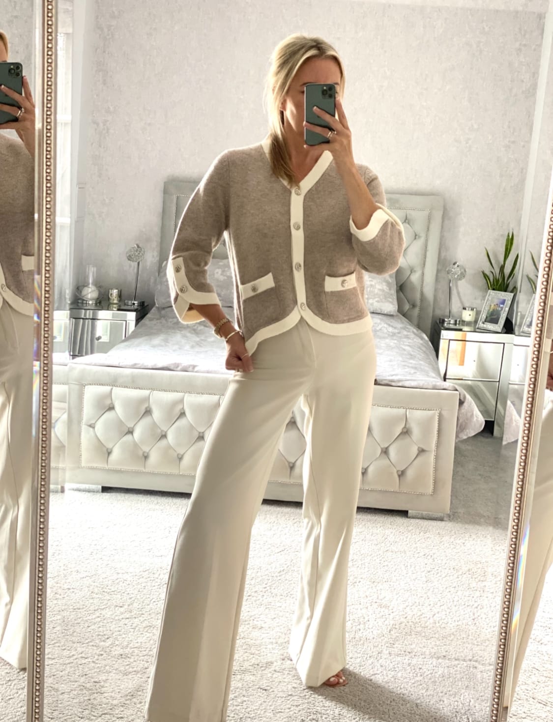 A chic two-tone cropped cardigan with three-quarter sleeves, elegant silver buttons and the perfect fit for high waisted jeans or trousers.