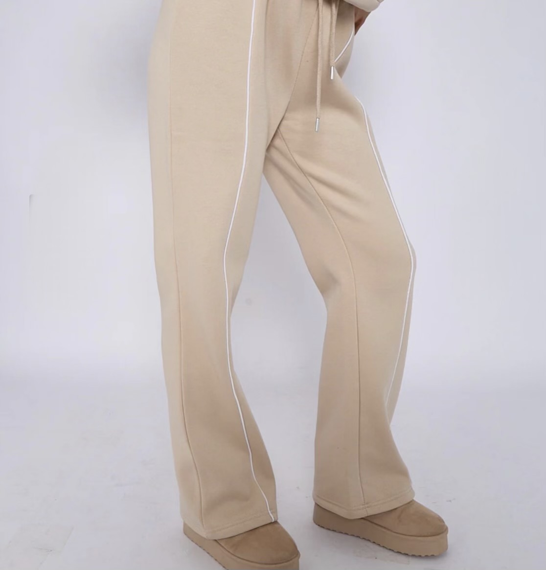 Stay cosy and stylish in this soft beige tracksuit set, designed for both comfort and elevated everyday style. The set includes a round-neck top and matching wide-leg trousers, both featuring crisp white piping down the sleeves and legs for a clean, sporty contrast.