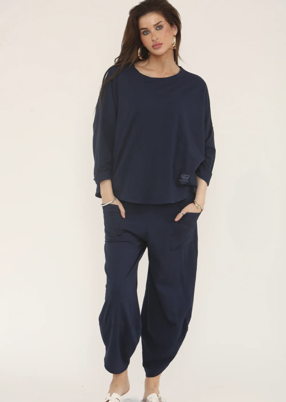 This oversized loungewear set, designed to comfortably fit sizes 8 to 16, features soft fabric, a relaxed barrel-leg bottom that flatters petite frames by giving a full-length look, and a simple round-neck top—perfect for school runs, layering with boots and a coat, or just relaxing in cozy style.”